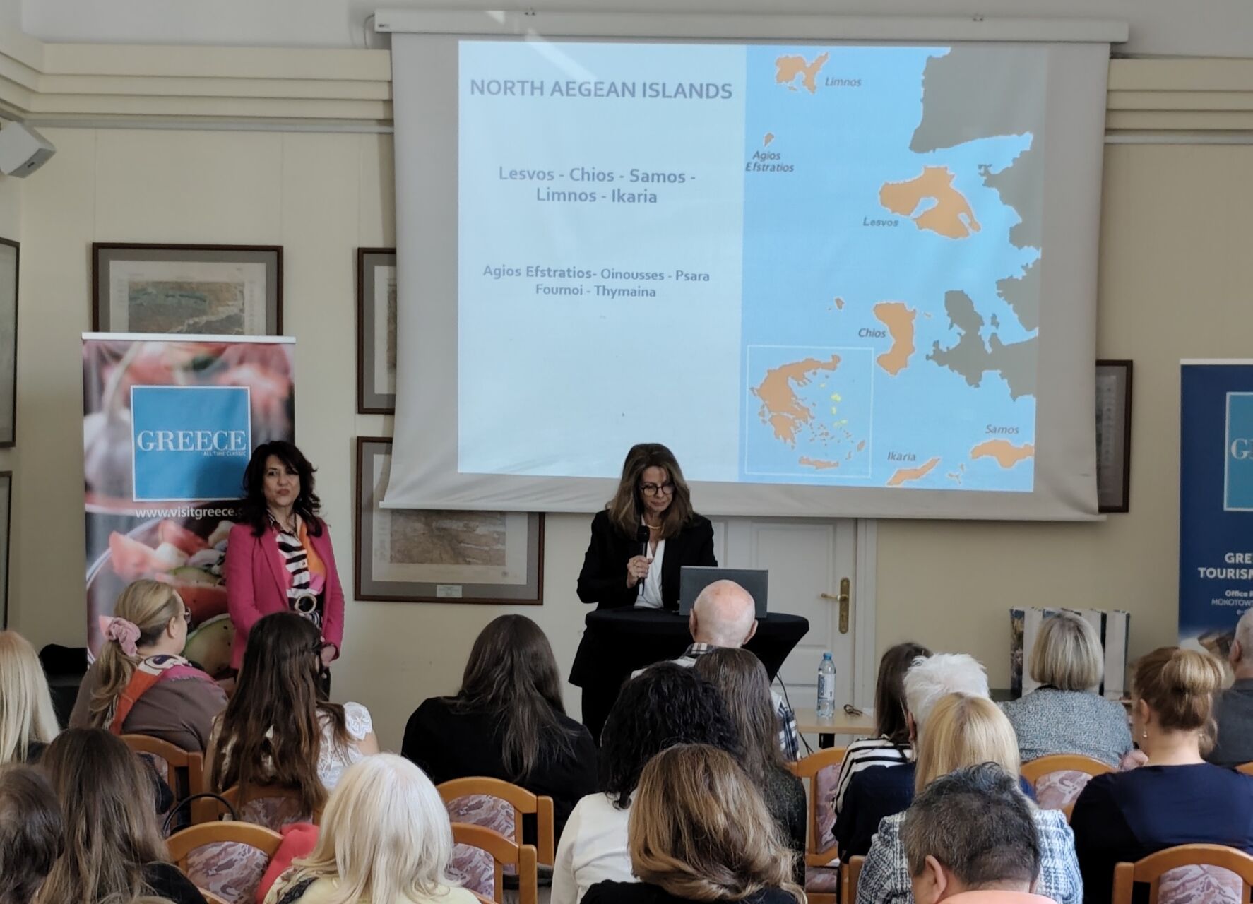 Οι επικεφαλής Δ/νσεων Τουρισμού Ιονίου και Βορείου Αιγαίου, κ.κ. Μάγδα Λούβρου και Αγγελική Πολιτάκη αντίστοιχα, παρουσίασαν τους προορισμούς τους, ενώ παρέστη και η Προϊστάμενη του Τμήματος τουρισμού της Περιφερειακής Ενότητας Χίου, κ. Μαρία Κόβα.