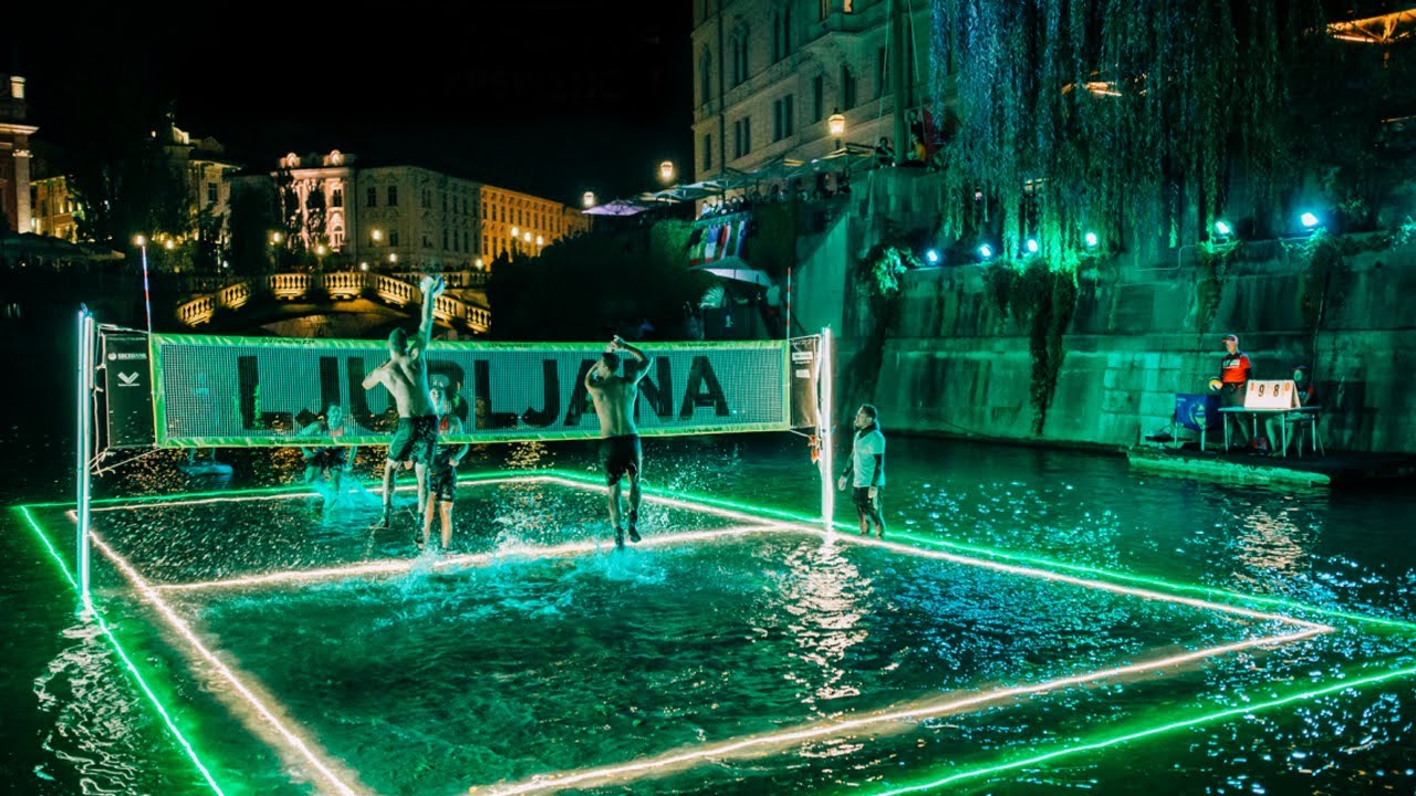 Το Βόλεϊ στο Νερό δεν είναι απλώς μια αθλητική εκδήλωση. Είναι ένα σουρεαλιστικό αστικό θέαμα που μετατρέπει τον ποταμό Λιουμπλιάνιτσα σε μια λαμπερή αρένα φωτός, κίνησης και συναισθήματος.