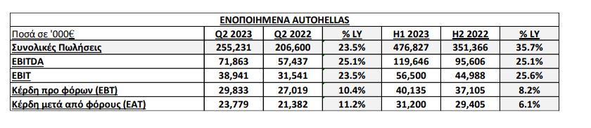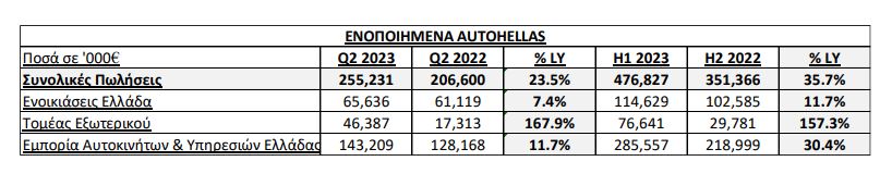 Σε επίπεδο εξαμήνου η Autohellas παρουσιάζει αύξηση 35,7% στον Ενοποιημένου Κύκλου Εργασιών, ο οποίος ανήλθε σε €476,8εκ. έναντι €351,4εκ. το 2022.