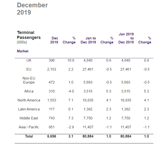 Περισσότεροι από 6,7 εκατομμύρια επιβάτες ταξίδεψαν μέσω του Χίθροου κατά τη διάρκεια της εορταστικής περιόδου, καθιστώντας το αεροδρόμιο το πιο πολυσύχναστο το Δεκέμβριο, αυξάνοντας κατά 3,1% σε σχέση με την αντίστοιχη περσινή χρονιά. Αυτή ήταν και η ισχυρότερη μηνιαία αύξηση που σημειώθηκε για το 2019.