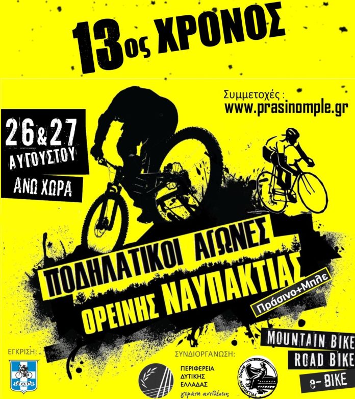 Σε υψόμετρο 1.100 μέτρα, μέσα σε δάσος από έλατα και καστανιές, ποτάμια και καταρράκτες υλοποιούνται για 13η συνεχόμενη χρονιά οι open “ 13οι Ποδηλατικοί Αγώνες Ορεινής Ναυπακτίας”, από την Περιβαλλοντική Οργάνωση “Πράσινο+Μπλε”, σε συνδιοργάνωση με την Περιφέρεια Δυτικής Ελλάδας, τον Δήμο Ναυπακτίας και με την έγκριση της Ελληνικής Ομοσπονδίας Ποδηλασίας.