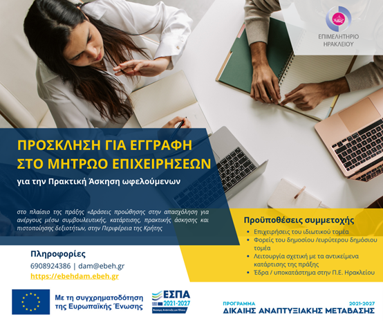 Το Επιμελητήριο Ηρακλείου προσκαλεί επιχειρήσεις του ιδιωτικού τομέα και φορείς του δημόσιου/ευρύτερου δημόσιου τομέα, με έδρα ή/και υποκατάστημα στην Περιφερειακή Ενότητα Ηρακλείου, να εγγραφούν στο Μητρώο Επιχειρήσεων Πρακτικής Άσκησης για την υποδοχή ωφελουμένων της Πράξης «Δράσεις προώθησης στην απασχόληση για ανέργους, μέσω συμβουλευτικής, κατάρτισης, πρακτικής άσκησης και πιστοποίησης δεξιοτήτων, στη Περιφέρεια της Κρήτης» με MIS 6001140.