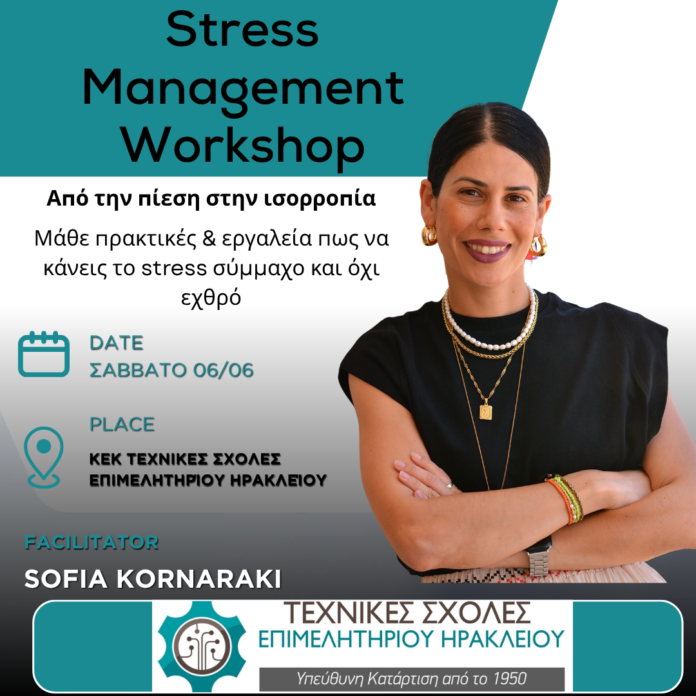 Ένα βιωματικό και πρακτικό workshop που βοηθά τους συμμετέχοντες να κατανοήσουν το Stress και να αποκτήσουν άμεσα εφαρμόσιμα εργαλεία για τη διαχείριση του άγχους διοργανώνει το ΚΕΚ ΤΕΧΝΙΚΕΣ ΣΧΟΛΕΣ του Επιμελητηρίου Ηρακλείου.