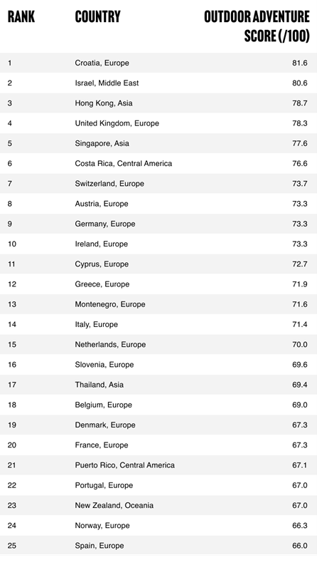 Στη συνέχεια, διαμορφώθηκε μια βαθμολογία «Outdoor Adventure/100» για να αποκαλύψει τους καλύτερους προορισμούς για όσους αναζητούν ένα διάλειμμα γεμάτο δραστηριότητες.