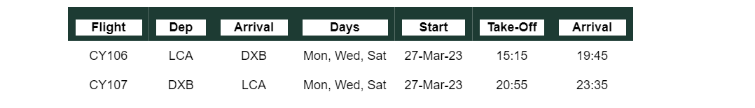 Το νέο αυτό δρομολόγιο θα συνδέσει την Κύπρο με τα Εμιράτα, δημιουργώντας πολλαπλές επιλογές συνδεσιμότητας με τη Μέση Ανατολή, την Άπω Ανατολή και πολλούς άλλους παγκόσμιους προορισμούς.