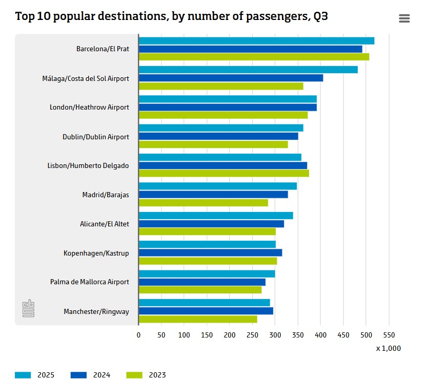 - Οι περισσότεροι επιβάτες που αναχώρησαν από το αεροδρόμιο Schiphol του Άμστερνταμ ταξίδευαν προς/από το Ελ Πρατ της Βαρκελώνης (442.000), ακολουθούμενο από το Χίθροου σε Λονδίνο (392.000).