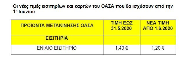 - Στην Αθήνα η τιμή του βασικού εισιτηρίου του ΟΑΣΑ ορίζεται στο 1.20 ευρώ αντί για 1.40 που ισχύει έως σήμερα – δηλαδή στρογγυλοποιείται προς τα κάτω και πέραν του ποσοστού μείωσης του Φ.Π.Α.