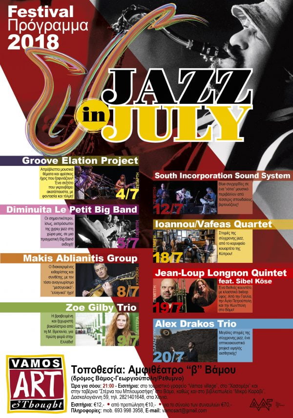Ανοίγει αύριο τις πύλες του, στο Βάμο Αποκορώνου Χανίων, το 7ο Jazz in July festival 2018, που και φέτος, φιλοξενεί μερικά από τα κορυφαία ονόματα της ελληνικής και διεθνούς μουσικής σκηνής.