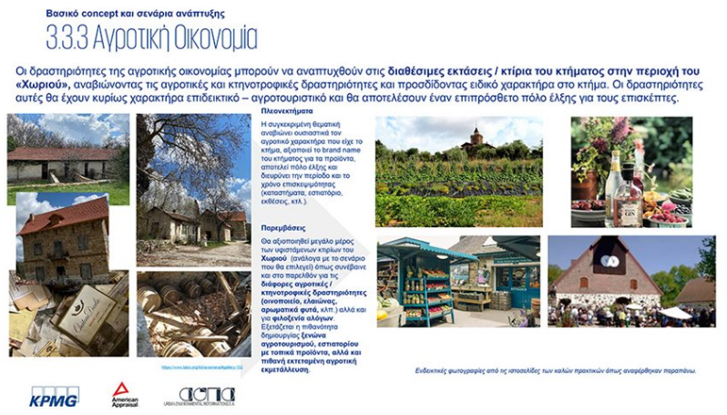 Έμφαση θα δοθεί στην αναβίωση της γεωργικής και κτηνοτροφικής δραστηριότητας του κτήματος ενώ έχουν ήδη ξεκινήσει οι συζητήσεις για την δημιουργία ελληνικού αμπελώνα.