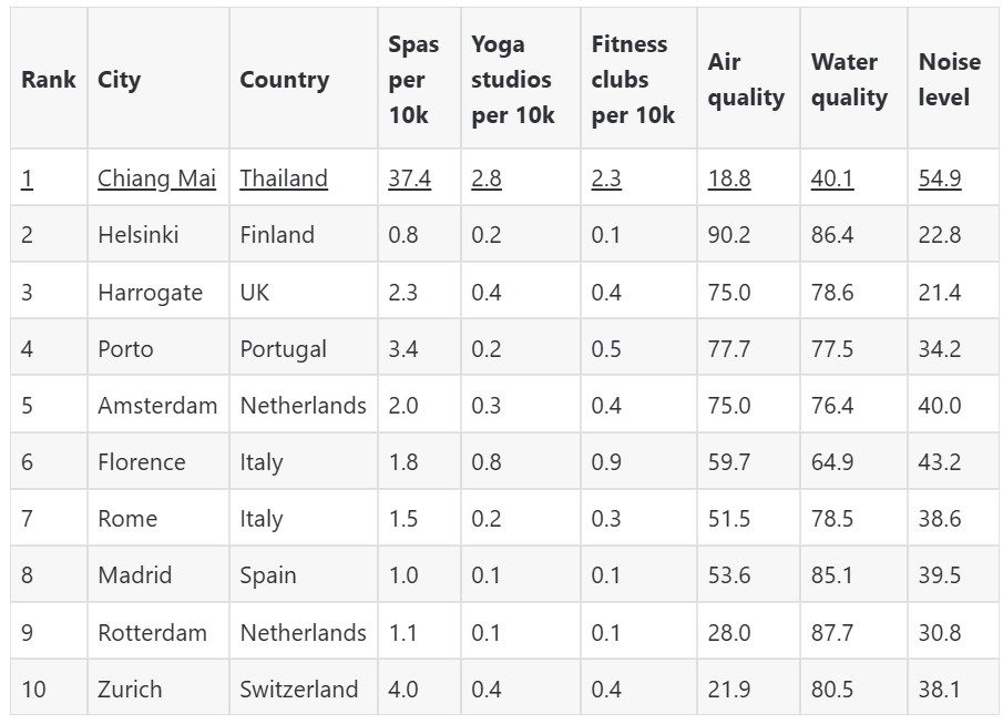 Το Τσιάνγκ Μάι στην Ταϊλάνδη κατέλαβε την κορυφή με τις περισσότερες εγκαταστάσεις spa (37,4 ανά 10.000 άτομα), στούντιο γιόγκα (2,8 ανά 10.000 άτομα) και γυμναστήρια (2,3 ανά 10.000 άτομα) από οποιαδήποτε πόλη που αναλύθηκε.