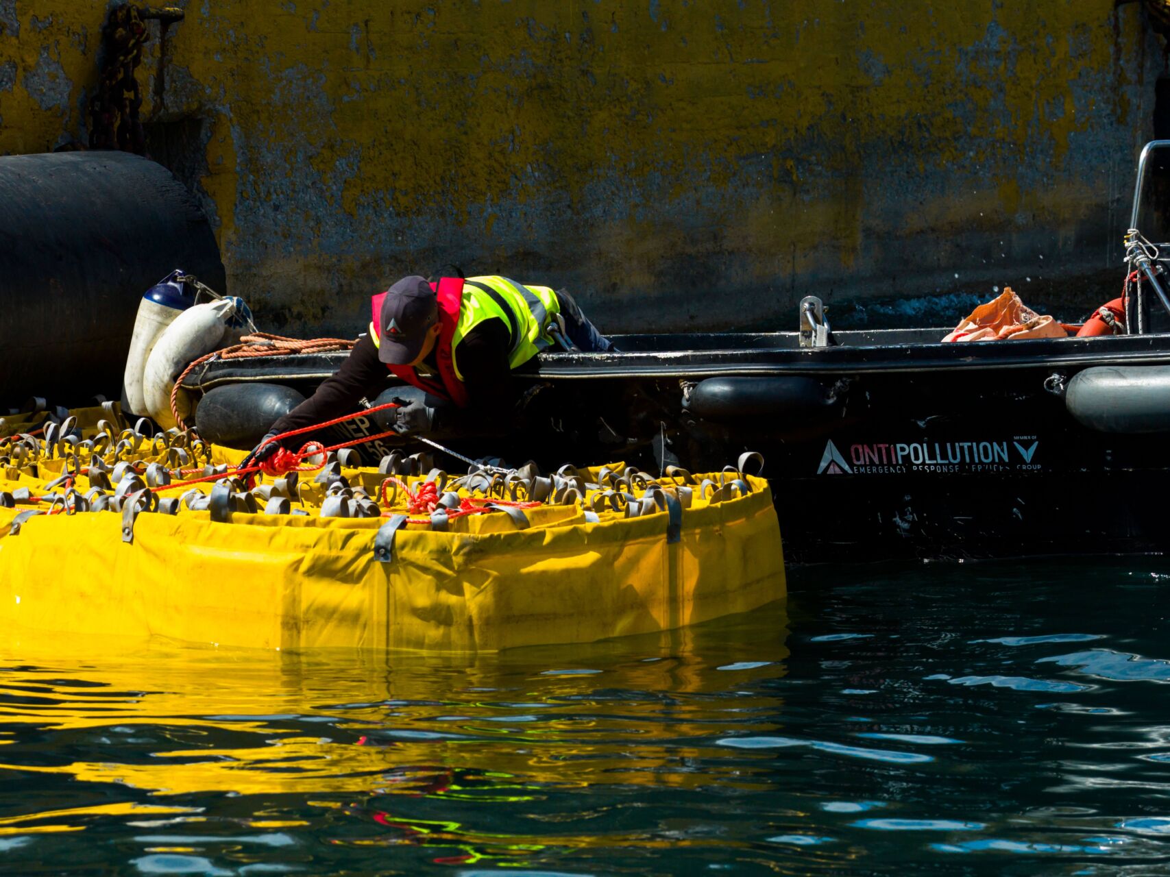 Πλωτό φράγμα αναπτύχθηκε επίσης περιμετρικά του κρουαζιερόπλοιου, με την υποστήριξη των σκαφών αντιμετώπισης Orca, Eco Wave και Fighter.