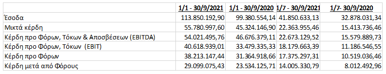 Τα κέρδη προ φόρων, τόκων, αποσβέσεων και επενδυτικών αποτελεσμάτων (EBITDA) της εταιρίας, που ανήλθαν σε Ευρώ 54.021 χιλ. στην περίοδο 01.01.2021‐30.09.2021 και σε Ευρώ 22.673 χιλ. κατά το Γ΄ τρίμηνο, έναντι Ευρώ 46.676 χιλ. και Ευρώ 15.580 χιλ. στις αντίστοιχες περιόδους της προηγούμενης χρήσης 2020, παρουσιάζοντας αύξηση κατά 15,74% και 45,53% αντίστοιχα.