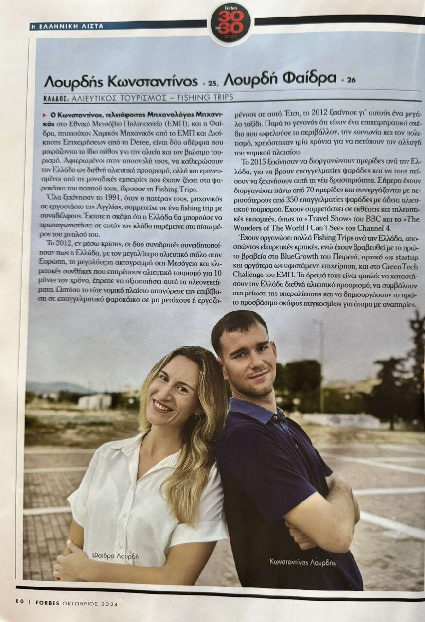 Ο Γιώργος Λουρδής, με μακρόχρονη εμπειρία στον χώρο του τουρισμού, έθεσε τα θεμέλια της πλατφόρμας Fishing Trips ήδη από το 2012. Σήμερα, τα παιδιά του, η Φαίδρα Λουρδή και ο Κωνσταντίνος Λουρδής, όχι μόνο συνεχίζουν αλλά εξελίσσουν το όραμα, συνδέοντας το ψάρεμα με την κοινωνική επιχειρηματικότητα. Η Φαίδρα και ο Κωνσταντίνος βραβεύτηκαν στη λίστα Forbes 30 Under 30 Greece 2025, εκπροσωπώντας την Ελλάδα στον τομέα του αλιευτικού τουρισμού ως σύγχρονο παράδειγμα καινοτομίας με κοινωνικό αντίκτυπο.