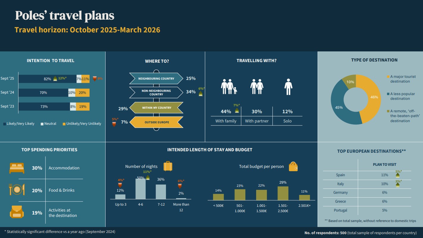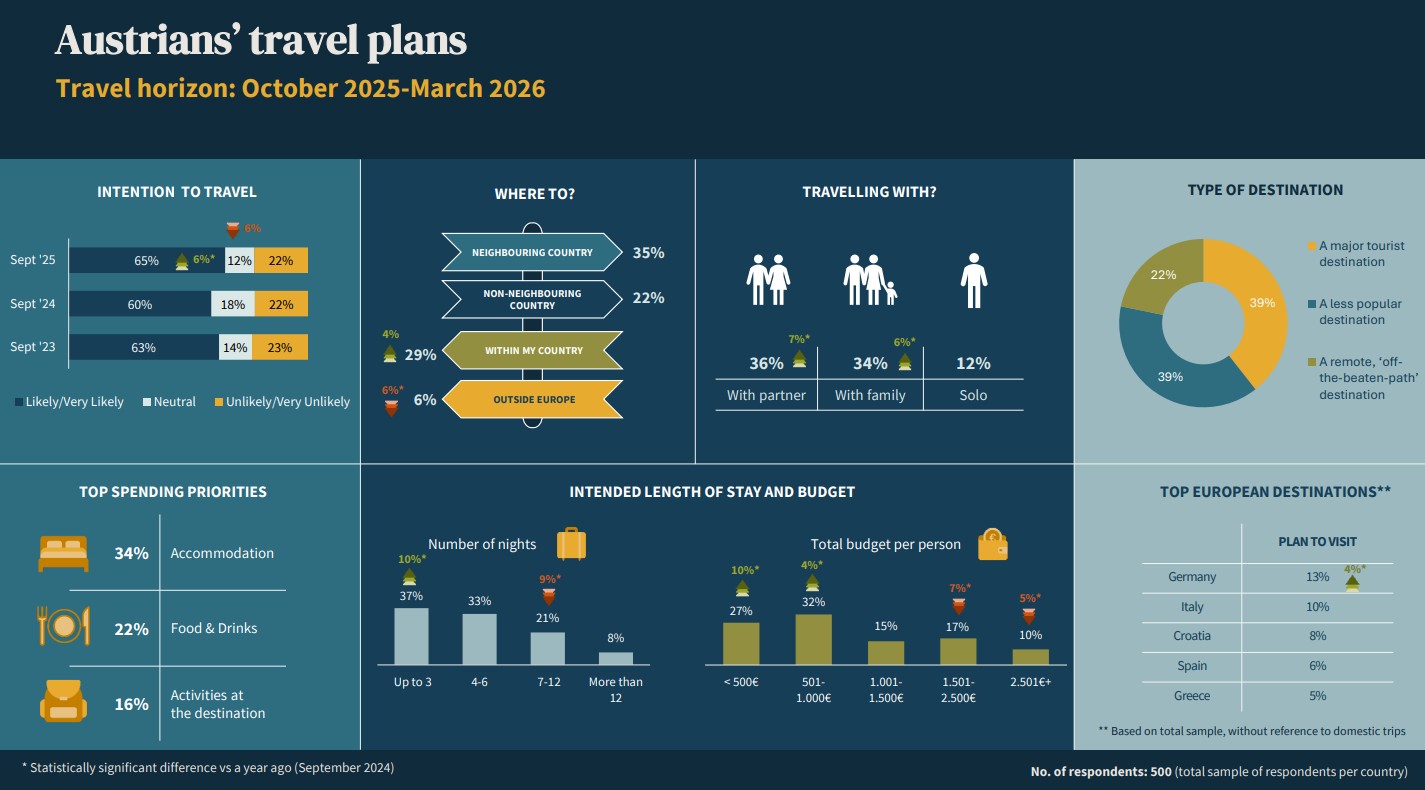 - Τα διεθνή ταξίδια εντός της Ευρώπης βρίσκονται σε άνοδο. Οι περισσότεροι Ευρωπαίοι (63%) σχεδιάζουν να ταξιδέψουν εκτός της χώρας καταγωγής τους αυτό το φθινόπωρο και τον χειμώνα, μια αξιοσημείωτη αύξηση 3% από το περασμένο φθινόπωρο.