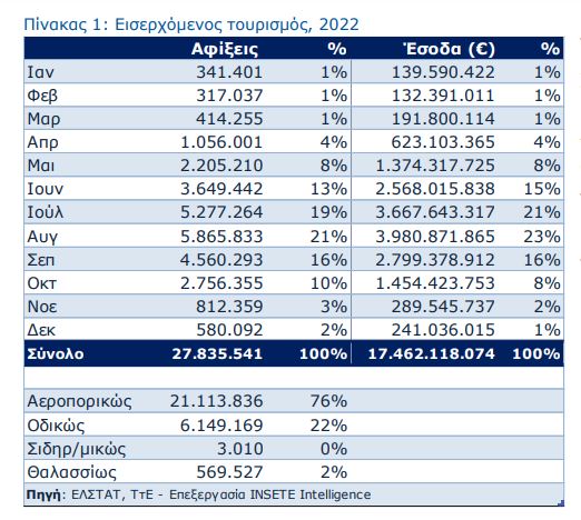 - Ο εισερχόμενος τουρισμός ανέκαμψε σχεδόν πλήρως στα προ πανδημίας επίπεδα: οι εισπράξεις από τον εισερχόμενο τουρισμό ήταν κατά μόλις -1,2% λιγότερες σε σχέση με το 2019 (17,5 δις ευρώ το 2022 έναντι 17,7 δις το 2019).