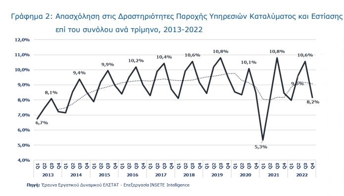 Όπως εκτιμάται σε σχετική μελέτη για τη απασχόληση στα καταλύματα, την εστίαση και τους λοιπούς κλάδους της ελληνικής οικονομίας: