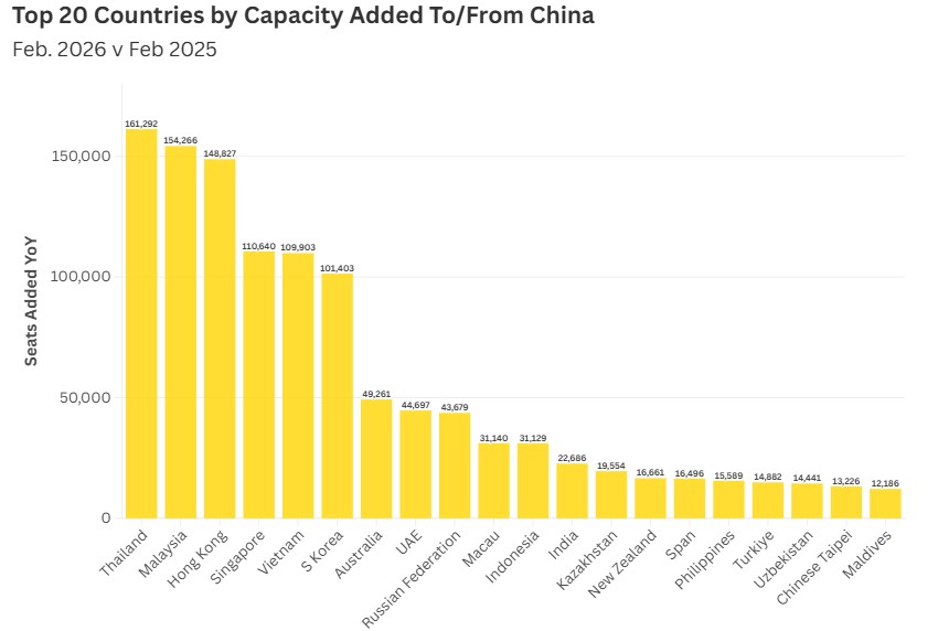 Tα τελευταία στοιχεία δείχνουν ότι, η εγχώρια χωρητικότητα είναι σχεδόν 8% υψηλότερη αυτόν τον Φεβρουάριο σε σχέση με πέρυσι. Αυτό σημαίνει, ότι φέτος υπάρχουν περισσότερες επιλογές για τα εσωτερικά ταξίδια των Κινέζων.