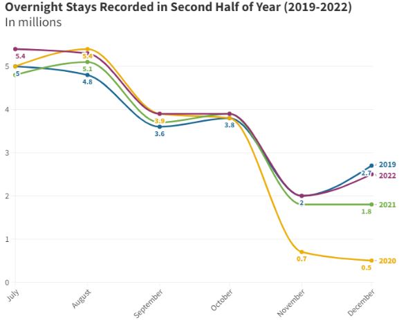 Ο συνολικός αριθμός των διανυκτερεύσεων το 2022 έφτασε τα 2,73 δις, μόλις 5% κάτω από τα επίπεδα του 2019 που καταγράφηκαν 2,88 δισεκατομμύρια διανυκτερεύσεις ετησίως.