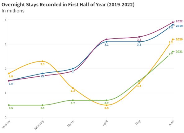 Καθώς οι αφίξεις τουριστών που καταγράφηκαν κατά τη διάρκεια των μηνών του 2022 ξεπέρασαν ακόμη και τα επίπεδα του 2019, ο αριθμός των διανυκτερεύσεων αυξήθηκε επίσης κατά 3,6 τοις εκατό, υποδηλώνοντας ότι οι επισκέπτες περνούσαν ακόμη περισσότερο χρόνο στις γερμανικές εγκαταστάσεις καταλυμάτων κατά τους χρόνους μετά την πανδημία.