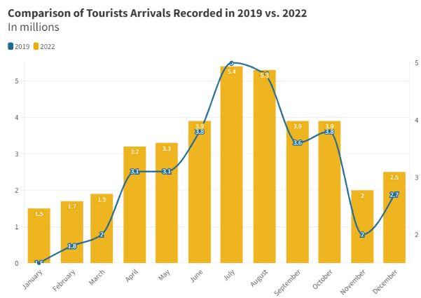 Τα στοιχεία δείχνουν επίσης ότι η διαφορά ως προς τις αφίξεις τουριστών που καταγράφηκαν το 2019 και το 2022 αντίστοιχα, είναι ακόμη πιο μικρή τον Νοέμβριο, καθώς τον Νοέμβριο του 2019 και τον Νοέμβριο του 2022, δύο εκατομμύρια τουρίστες έφτασαν στη χώρα.