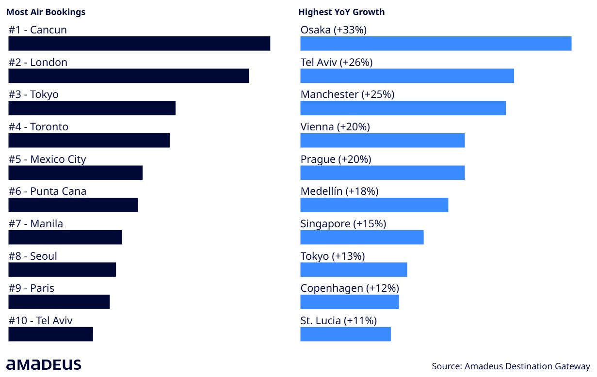 - Οι κρατήσεις για την Οσάκα (+33%) και το Τόκιο (+13%) συνεχίζουν να αυξάνονται, ξεπερνώντας την ανάπτυξη σε παραδοσιακά αγαπημένα μέρη όπως το Κανκούν και η Πούντα Κάνα.