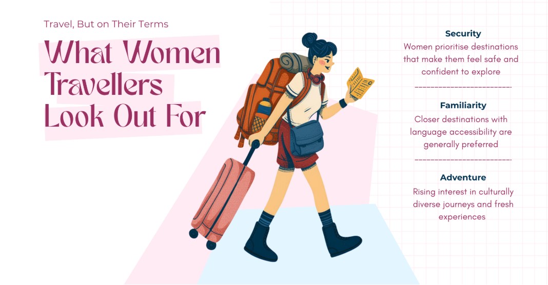 Οι γυναίκες ταξιδιώτες διευρύνουν τους ορίζοντές τους, αλλά με τους δικούς τους όρους. Ενώ οι πτήσεις μικρών αποστάσεων και οι κοντινότεροι προορισμοί εξακολουθούν να προτιμώνται, οι γυναίκες ταξιδιώτες εξερευνούν επίσης πιο απομακρυσμένες τοποθεσίες για τις περιπέτειές τους. Οι πτήσεις μεγάλων αποστάσεων κερδίζουν έδαφος με ταχύτερο ρυθμό, με την Ασία να βιώνει την ταχύτερη ανάπτυξη.