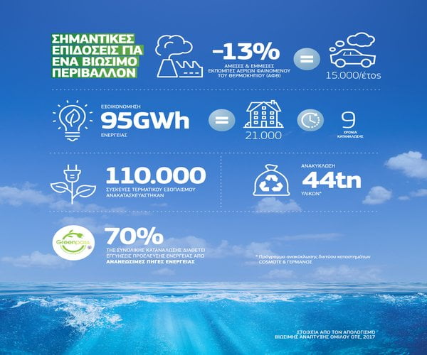 Επίσης, μέσα από το εκτεταμένο πρόγραμμα ανακύκλωσης κινητών τηλεφώνων, αξεσουάρ, οικιακών μπαταριών και μελανοδοχείων, που υλοποιούν τα καταστήματα COSMOTE και ΓΕΡΜΑΝΟΣ σε όλη την Ελλάδα, το 2017 συγκεντρώθηκαν 44 τόνοι ανακυκλώσιμων υλικών.