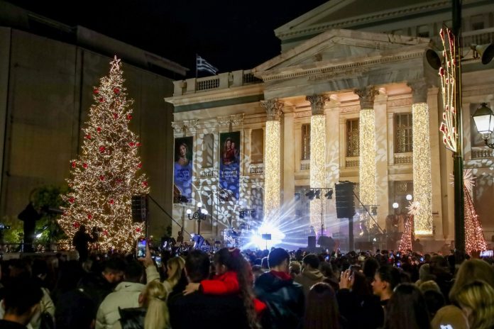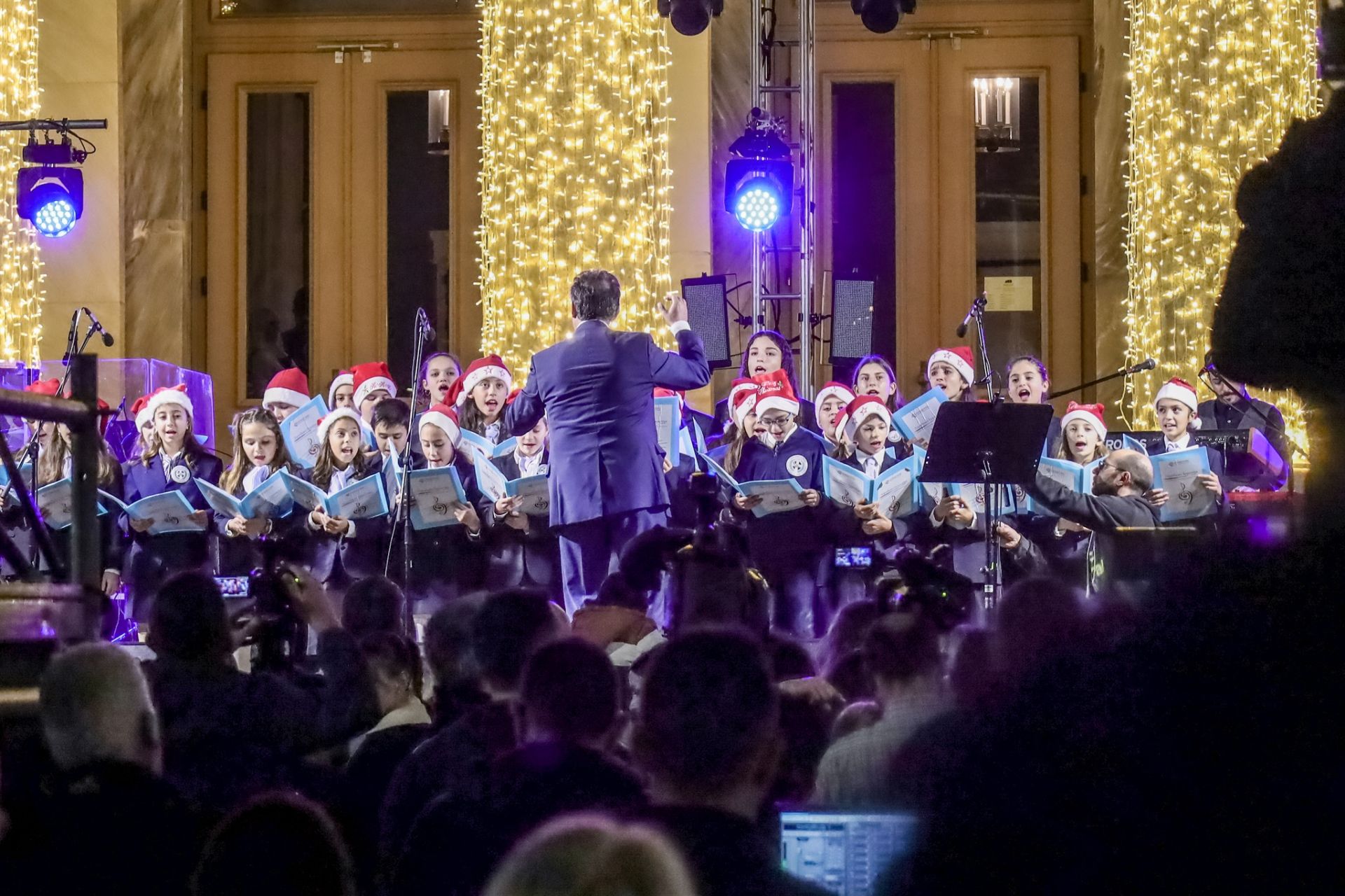 Ταυτόχρονα, άναψαν και τα φώτα του Δημαρχείου Πειραιά, δημιουργώντας μια ξεχωριστή Χριστουγεννιάτικη εικόνα στο κέντρο της πόλης.
