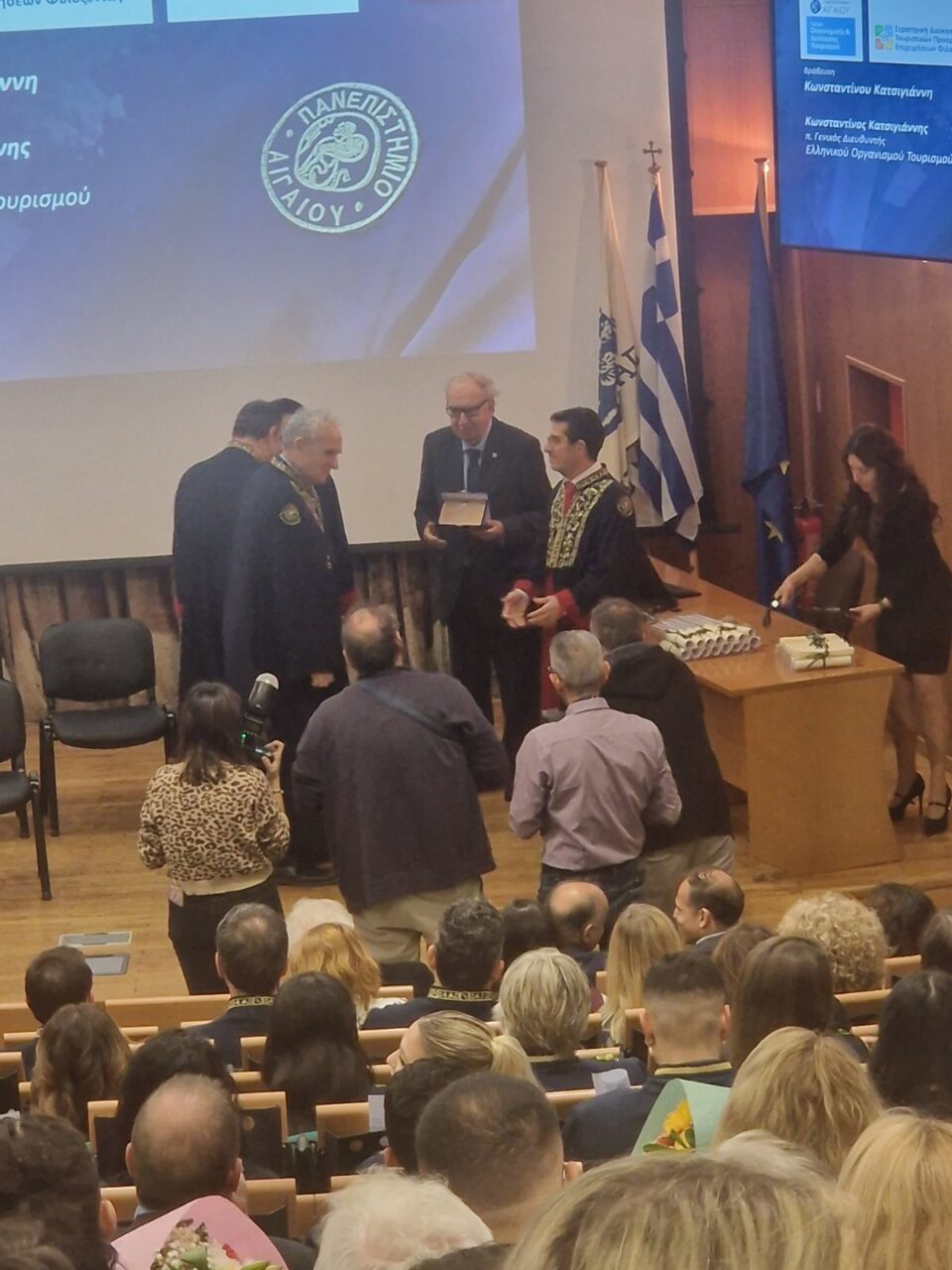 Ο Κώστας Κατσιγιάννης, πολιτικός μηχανικός, πρώην γενικός διευθυντής του Ε.Ο.Τ. βραβεύθηκε στις 10 Δεκεμβρίου 2025 από το Πανεπιστήμιο Αιγαίου (Τμήμα Οικονομικής και Διοίκησης Τουρισμού στη Χίο) για τη μακρόχρονη υπηρεσία του στον Ε.Ο.Τ. επί 35 έτη, για τη σημαντική και πολύπλευρη συνεισφορά του στο σχεδιασμό, στην ανάπτυξη και την προβολή του Ελληνικού Τουρισμού, για την πλούσια συγγραφική και κοινωνική του δράση καθώς και για τη σταθερή συμμετοχή και ενεργό συμβολή του στην προώθηση δράσεων που αφορούν στον τουρισμό της Περιφέρειας βορείου Αιγαίου και της νήσου Χίου, ενισχύοντας την τοπική οικονομία και κοινωνία.