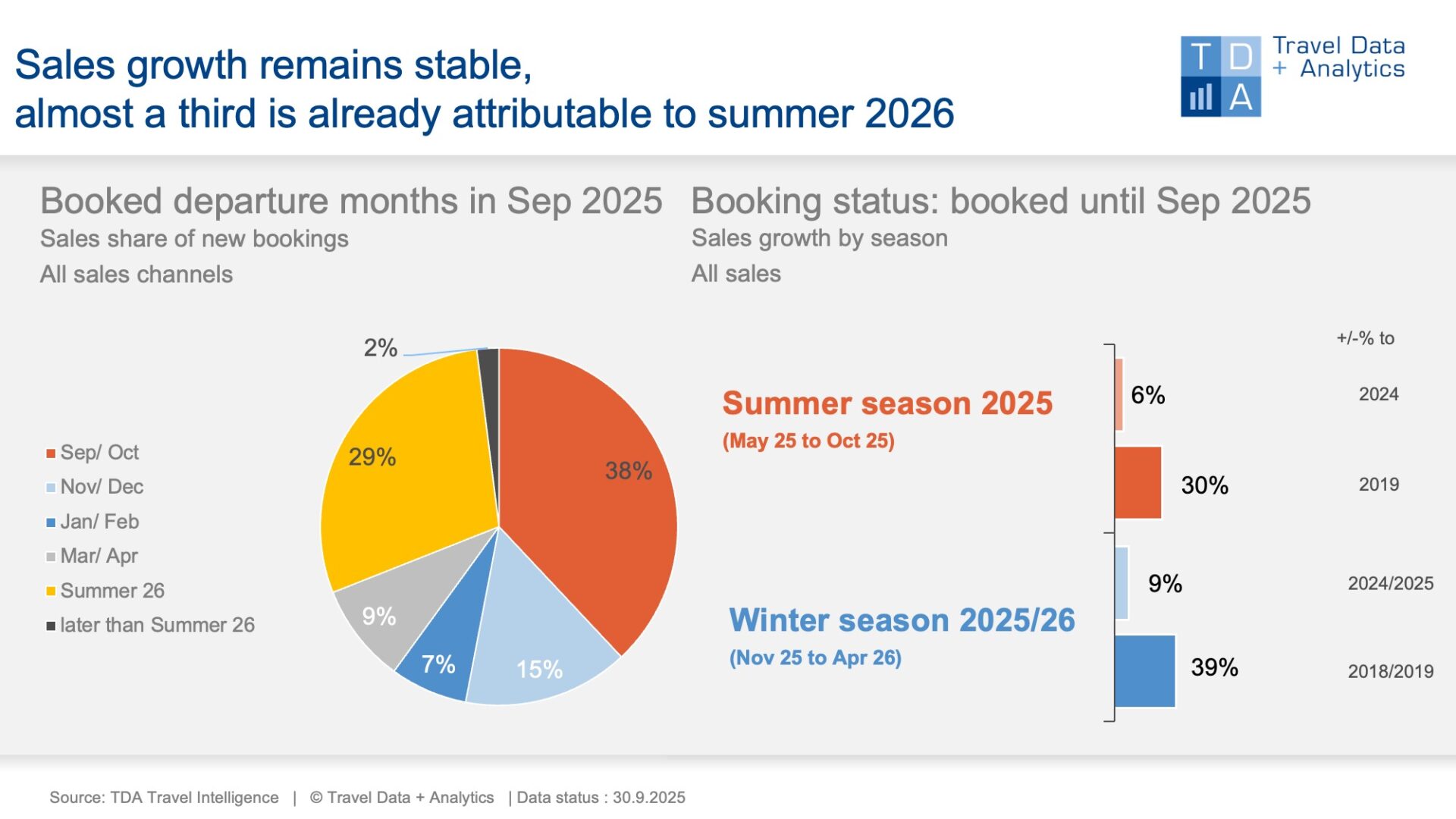 Οι πωλήσεις είναι στο 24% σε σύγκριση με πέρυσι. Μαζί με τις έγκαιρες κρατήσεις για ακόμη πιο μεταγενέστερες ημερομηνίες ταξιδιού, αντιπροσωπεύουν το 31% των πωλήσεων του Σεπτεμβρίου, το ίδιο ποσοστό με την επερχόμενη χειμερινή περίοδο.