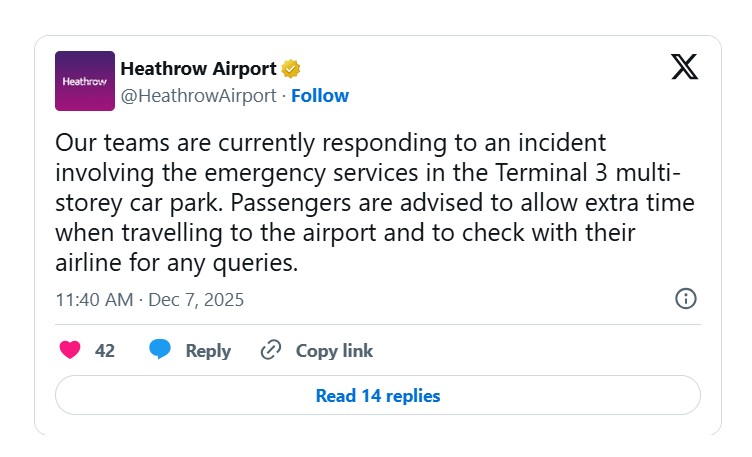 Ο μεγαλύτερος αερολιμένας σε Ηνωμένο Βασίλειο συμβουλεύει τους επιβάτες να διαθέτουν επιπλέον χρόνο όταν ταξιδεύουν προς το αεροδρόμιο και να επικοινωνούν με την αεροπορική τους εταιρεία για ενημέρωση.