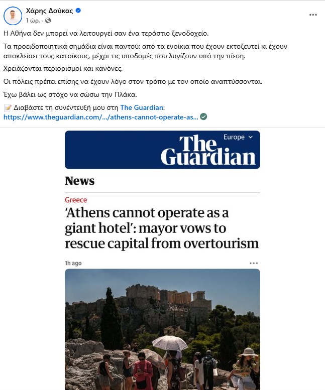 Ο Δήμαρχος Αθηναίων Χάρης Δούκας, σε συνέντευξη που παραχώρησε στη The Guardian, κρούει τον κώδωνα του κινδύνου για τον υπερτουρισμό στην πόλη.