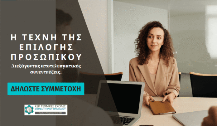 Σημαντικές γνώσεις σχετικά με τις σύγχρονες τεχνικές επιλογής προσωπικού και τον τρόπο διεξαγωγής συνεντεύξεων που οδηγούν στις σωστές προσλήψεις, παρέχει το σεμινάριο «Η Τέχνη της Επιλογής Προσωπικού. Διεξάγοντας αποτελεσματικές συνεντεύξεις» που διοργανώνει το ΚΕΚ Τεχνικές Σχολές του Επιμελητηρίου Ηρακλείου.