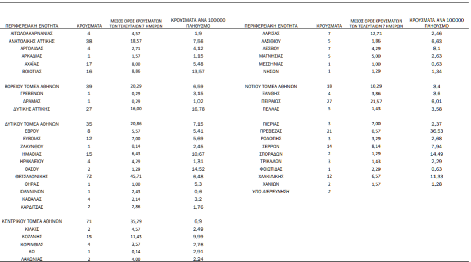 Λίγο λιγότερα από τα μισά -τα 256- εντοπίζονται στην Αττική. Στη Θεσσαλονίκη καταγράφηκαν 72 κρούσματα, ενώ υπάρχουν άλλες 8 περιφέρειες στις οποίες εντοπίζεται διψήφιος αριθμός κρουσμάτων.