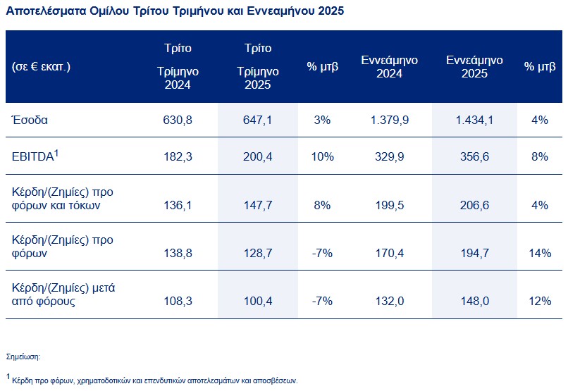 Ο ενοποιημένος κύκλος εργασιών για το Γ’ τρίμηνο ανήλθε σε €647,1 εκατ., τα Κέρδη EBITDA ανήλθαν σε €200,4 εκατ. ενισχυμένα κατά 10%, και η λειτουργική κερδοφορία EBIT ανήλθε σε €147,7 εκατ. αυξημένη κατά 8% αντίστοιχα σε σχέση με το αντίστοιχο τρίμηνο του 2024.