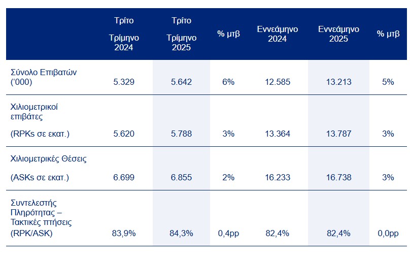 Το Γ’ τρίμηνο η ΑΕGEAN προσέφερε 6,6 εκατ. διαθέσιμες θέσεις, 5% περισσότερες από το Γ’ τρίμηνο του 2024 ενώ μετέφερε 5,6 εκατ. επιβάτες, 6% περισσότερους από το Γ΄ τρίμηνο του 2024.