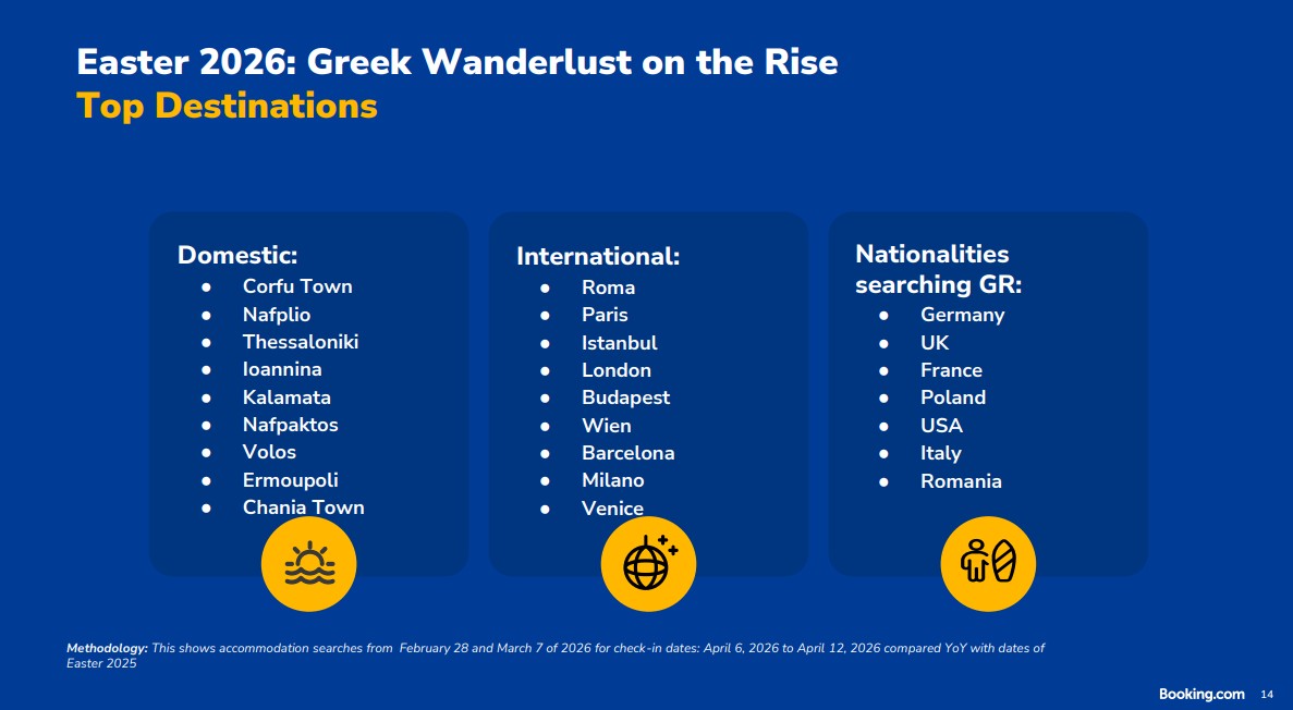 Οι διεθνείς τουρίστες που αναζητούν ελληνικούς προορισμούς για ταξίδια το Πάσχα (κρατήσεις από τις 6 έως τις 12 Απριλίου) είναι από Γερμανία, Ηνωμένο Βασίλειο, Γαλλία, Πολωνία, ΗΠΑ, Ιταλία και Ρουμανία.