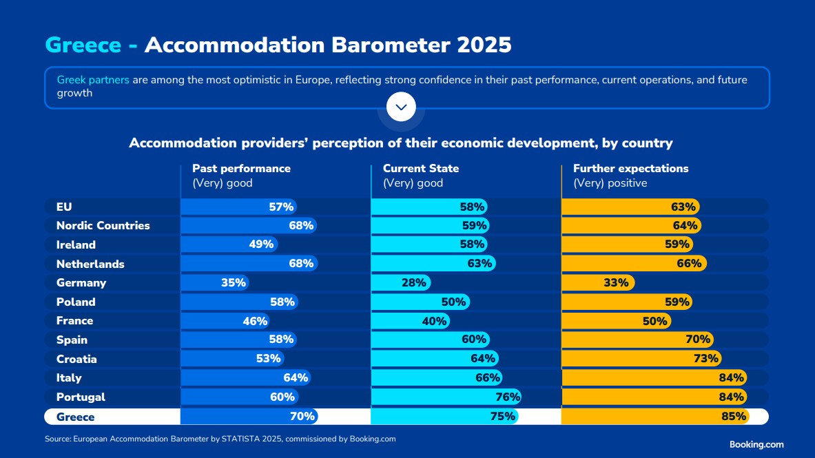 Οι Ελληνες ξενοδόχοι αποδεικνύονται όλο και πιο αισιόδοξοι αναφορικά με το μέλλον τους, σύμφωνα με το Βαρόμετρο 2025 της Βοοking.com σε συνεργασία με την Statista.