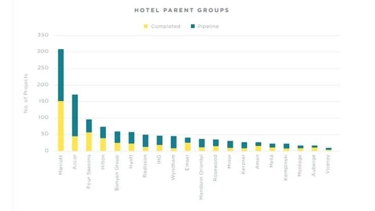 Τα ξενοδοχειακά brands εξακολουθούν να κυριαρχούν στην αγορά, τόσο στα ολοκληρωμένα projects όσο και στο pipeline. Μεγάλες αλυσίδες όπως η Marriott International και η Accor ηγούνται σε αριθμό αναπτύξεων, διαθέτοντας πολυδιάστατα χαρτοφυλάκια.