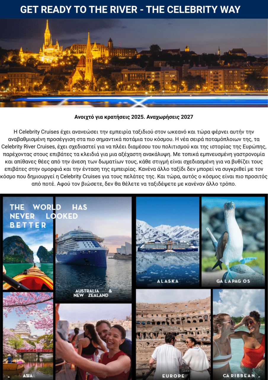 Η Celebrity Cruises ανοίγει την πρόσβαση προτεραιότητας για τις πρώτες κρουαζιέρες ποταμού της εταιρείας, που θα πραγματοποιηθούν το 2027 στα εμβληματικά ποτάμια Δούναβη και Ρήνο.