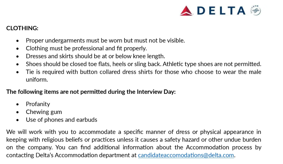 Το υπόμνημα, με τίτλο «Delta Air Lines Flight Attendant Hiring Appearance Requirements Acknowledgement», εξηγούσε ότι ενώ το προσωπικό πρέπει να είναι «παθιασμένο» με την εξυπηρέτηση των πελατών και να βοηθάει όπου μπορεί, πρέπει επίσης να είναι «περιποιημένο».