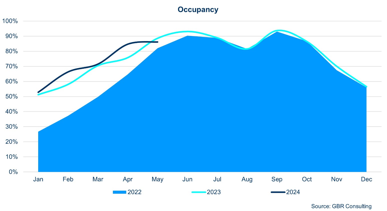 Ο δε Μάϊος ναι μεν σημείωσε καλύτερη πληρότητα έναντι των μηνών που προηγήθηκαν (86,2%) ωστόσο, η πληρότητα αυτή παρουσιάζει μείωση έναντι της αντίστοιχης πληρότητας Μαΐου του 2023 κατά 2,7%.