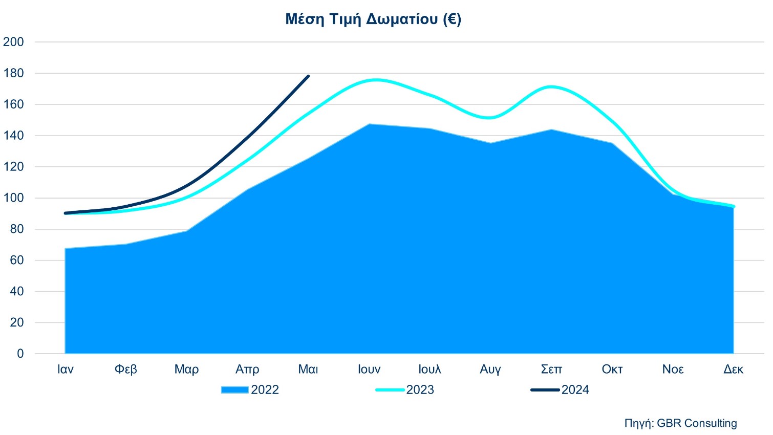 Η Μέση Τιμή Δωματίου (ADR) Μαΐου 2024 λοιπόν ήταν 178,16 ευρώ (δηλ. σημείωσε αύξηση κατά 15,6% έναντι του περσυνού Μαΐου) και το Έσοδο ανά Διαθέσιμο Δωμάτιο (RevPar) Μαΐου 2024 ήταν 153,50 ευρώ (αύξηση κατά 12,4% έναντι του αντίστοιχου RevPar Μαΐου 2023).